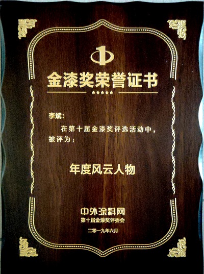 2019年6月,寶塔山漆李斌同志在中外涂料網(wǎng)第十屆金漆獎(jiǎng)評(píng)選活動(dòng)中被評(píng)為“年度風(fēng)云人物”