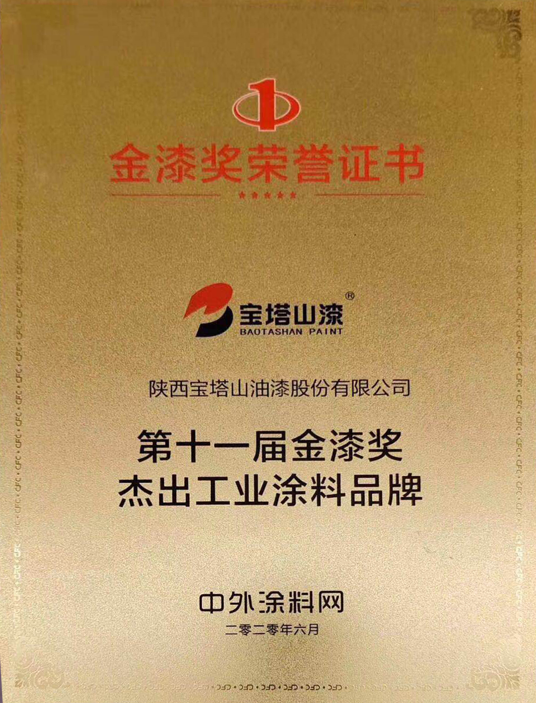 2020年6月,寶塔山漆榮獲第十一屆金漆獎(jiǎng)“杰出工業(yè)涂料品牌”
